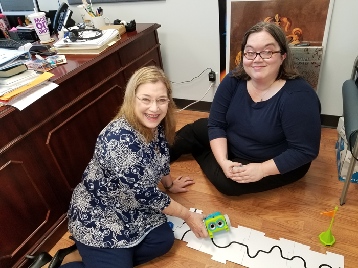1 20180918_101716 Jackson Hinds Library Executive Patty Furr and Deputy Director Kimberly Corbett demonstrate how interactive robotic toys teach computer programming fundamentals to elementary students.